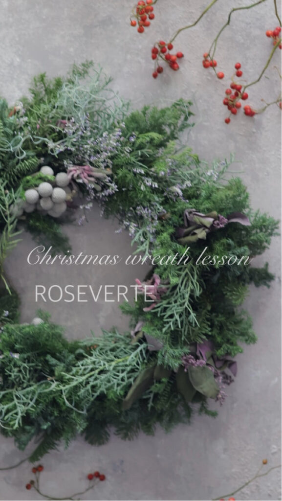 今回のクリスマスリースは1年間ブラッシュアップを受講して何かお伝えしたいことをテーマに花材選びをいたしました。